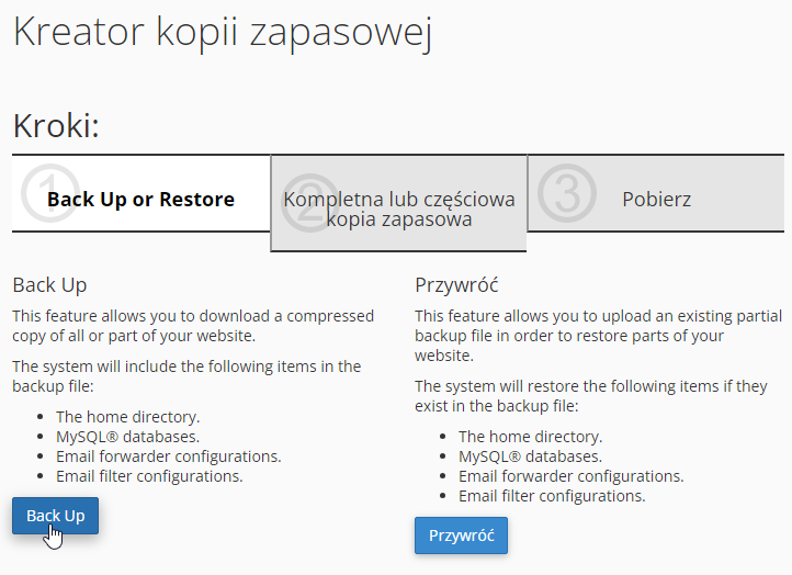 Zalecamy wykonanie pełnego backupu w cPanelu, ze względu na prostotę metody. W tym celu zaloguj się do swojego konta cPanel i przejdź do opcji “Kreator kopii zapasowej”. Kliknij “Back Up”, następnie “Pełna kopia zapasowa” i poczekaj na utworzenie kopii. Upewnij się, że posiadasz wystarczającą ilość miejsca na koncie hostingowym, ponieważ kopia WordPressa może zajmować sporo miejsca. Jeśli nie posiadasz dostatecznej ilości miejsca, skontaktuj się z nami w celu rozbudowy pakietu lub przejdź do następnego, uproszczonego kroku kopii zapasowej wyłącznie samej bazy danych WP.