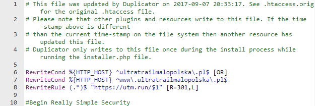 W miejscu “ultratrailmalopolska\.pl” wpisz swoją starą domenę a w miejscu “https://utm.run/$1” podaj nowy adres url przekierowania (z https lub http). Zapisz zmiany.