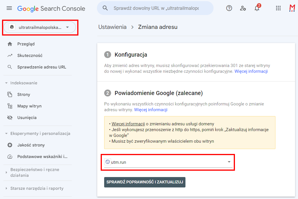 Przy zmianie URL strony zalecamy zaktualizować domenę w Google Search Console, aby zapewnić prawidłowe indeksowanie nowego adresu i zachować zdobytą pozycję w wynikach wyszukiwania.