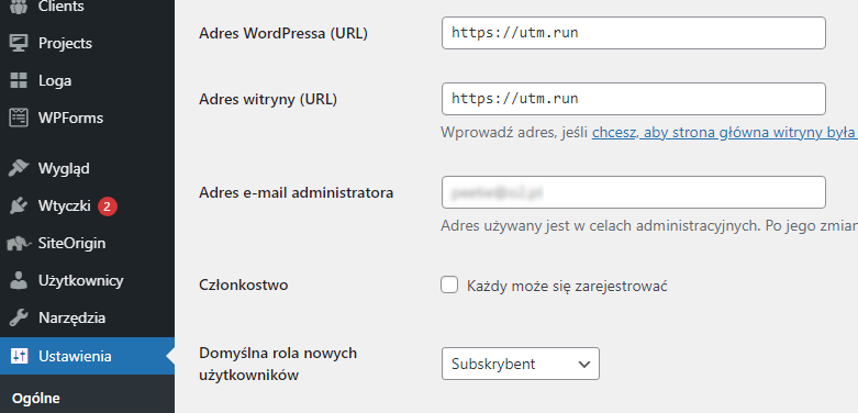 W pola “Adres WordPressa (URL)” oraz “Adres witryny (URL)” wpisz adres swojej nowej strony.