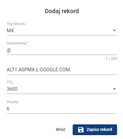 >Rekord MX wskazuje serwer, który będzie obsługiwać pocztę e-mail dla danej domeny lub subdomeny. Może być nazwą hosta w Twojej domenie, lub zewnętrzną nazwą serwera. Jeśli wpisujesz pełny adres hosta w polu Adres docelowy na końcu adresu musi znaleźć się kropka (na przykład "alt1.aspmx.l.google.com."). Jeśli ustawiasz kilka rekordów MX dla tej samej subdomeny, możesz wpisać priorytet ich używania (im niższy numer, tym wyższy priorytet).
