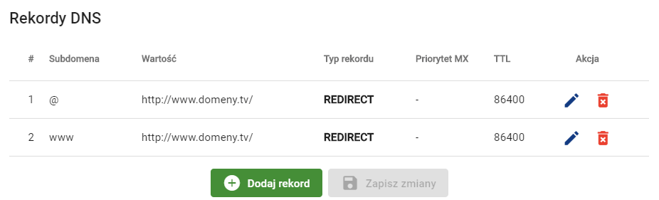 Przekierowanie jak wyżej, natomiast różni się tym, iż rekord "URL Redirect" po wejściu na naszą domenę będzie przenosił pod docelowy adres "http://www.domeny.tv/".