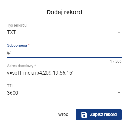 Przykładowe ustawienie serwera przekierowań dla rekordu TXT.